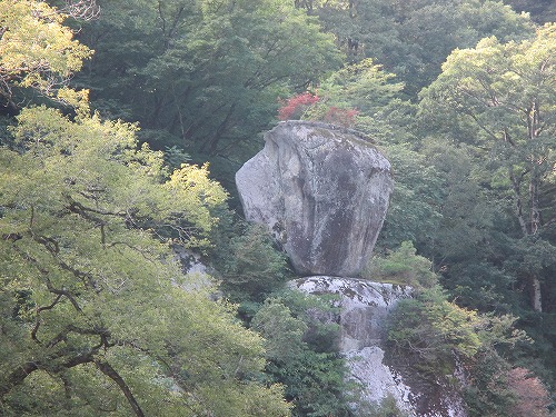 | 水瓶岩(はんどいわ) はんどのような形の岩が、大きな岩の上に絶妙のバランスで立っています。 |