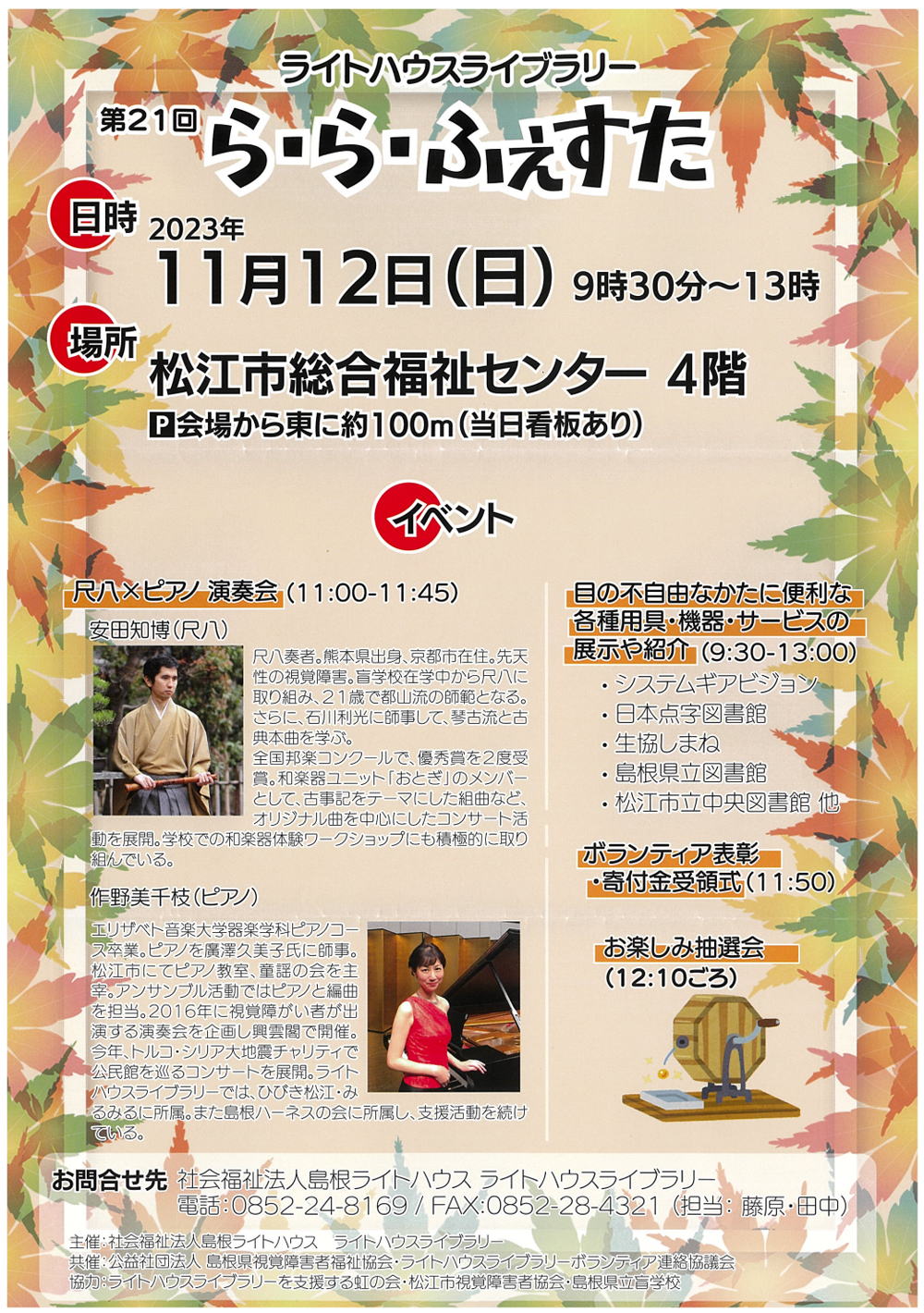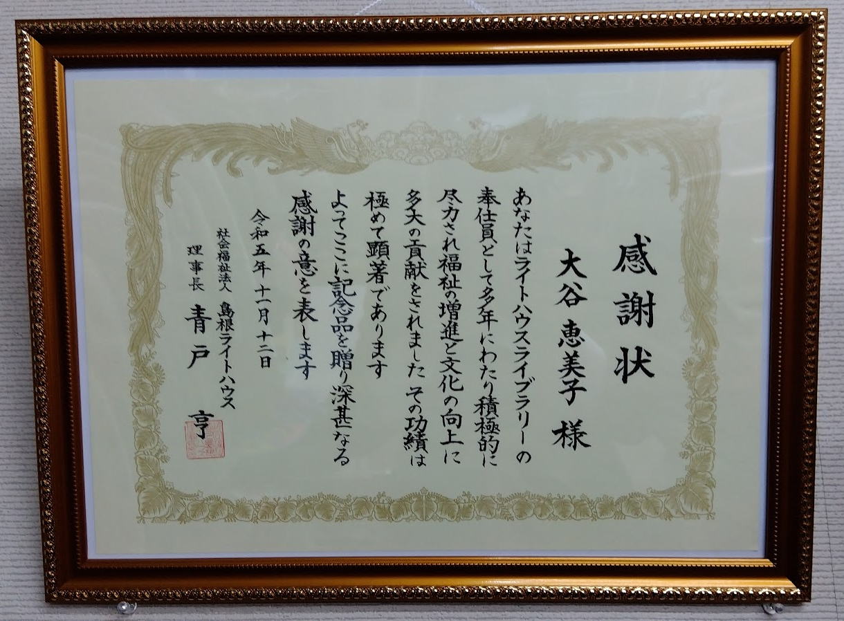 | 「第21回ら・ら・ふぇすた」にて社会福祉法人ライトハウス ライトハウスライブラリーより 感謝状をいただく。 | |