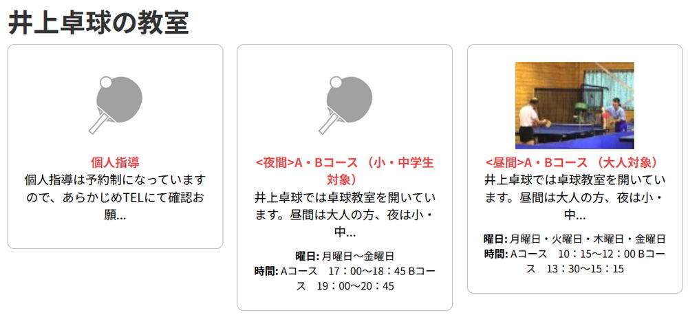井上卓球では卓球教室を開いています。昼間は大人の方、夜は小・中学生を対象に行っています。